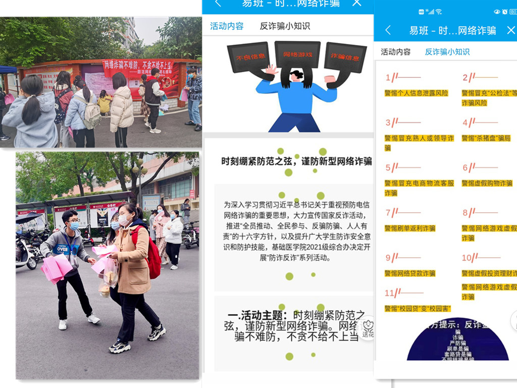 当前,校园网络诈骗案件日益增加,越来越多的大学生成为网络诈骗分子眼中的“肥羊”。为提高我校学生的网络诈骗防范意识,避免学生利益受到不法分子的侵害,11月11-13日,基础医学院2021级综合办在稻香苑和桂香苑门口开展了主题为“网络诈骗不难防,不贪不给不上当”的防范网络诈骗签名宣传活动,同时在易班上开展了“时刻紧绷防范之弦,谨防新型网络诈骗”的知识竞答活动。