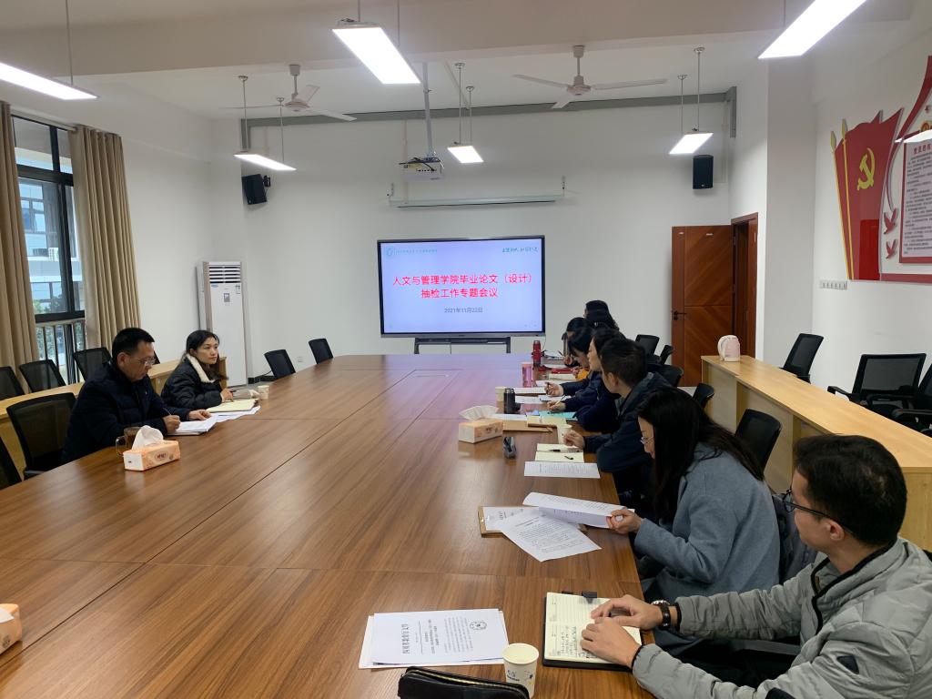 为贯彻落实《四川省本科毕业论文(设计)抽检实施细则(试行)》的通知精神,11月23日上午,人文与管理学院在文渊楼233会议室召开了本科毕业论文(设计)抽检工作专题会议。学院副院长李彦、各专业教研室负责人、教学秘书以及部分毕业论文指导教师参加了本次会议。会议由教务科科长聂咏飞主持。