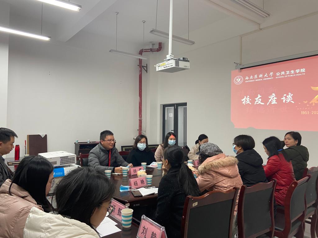 适逢西南医科大学建校70周年,公共卫生学院部分实践教学基地受邀来校参加庆祝大会,为进一步增进与校友的紧密联系、团结凝聚基地校友、引导校友关心学院发展,11月26日下午,公共卫生学院校友座谈会在仁济楼320会议室举行。学院副院长汤艳,内江市疾病预防控制中心副主任徐勇、办公室副主任于雪岚、主管医师刘春以及泸州市江阳区疾病预防控制中心副主任刘梦楠出席会议,学院各教研室主任及部分教师代表参加了会议,会议由汤艳主持。