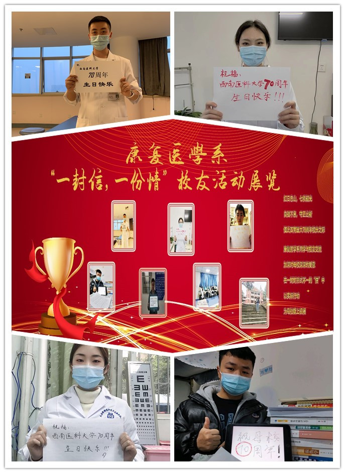 为庆祝西南医科大学建校70周年,营造浓厚的校庆氛围,通过在校同学与校友的互动交流,加强爱校荣校教育,11月10-28日,康复医学系开展“一封信,一份情”校友送祝福活动。
