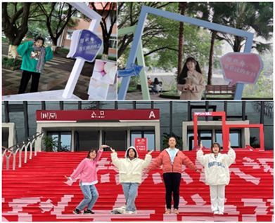 全班同学们以寝室为单位或自由组队进行分组,活动以在校园内的校庆打卡点进行创意拍照为主要形式,并写下自己对学校的祝福。最终通过全部同学投票,评选出最具创意奖、最佳人气奖、最佳文采奖。