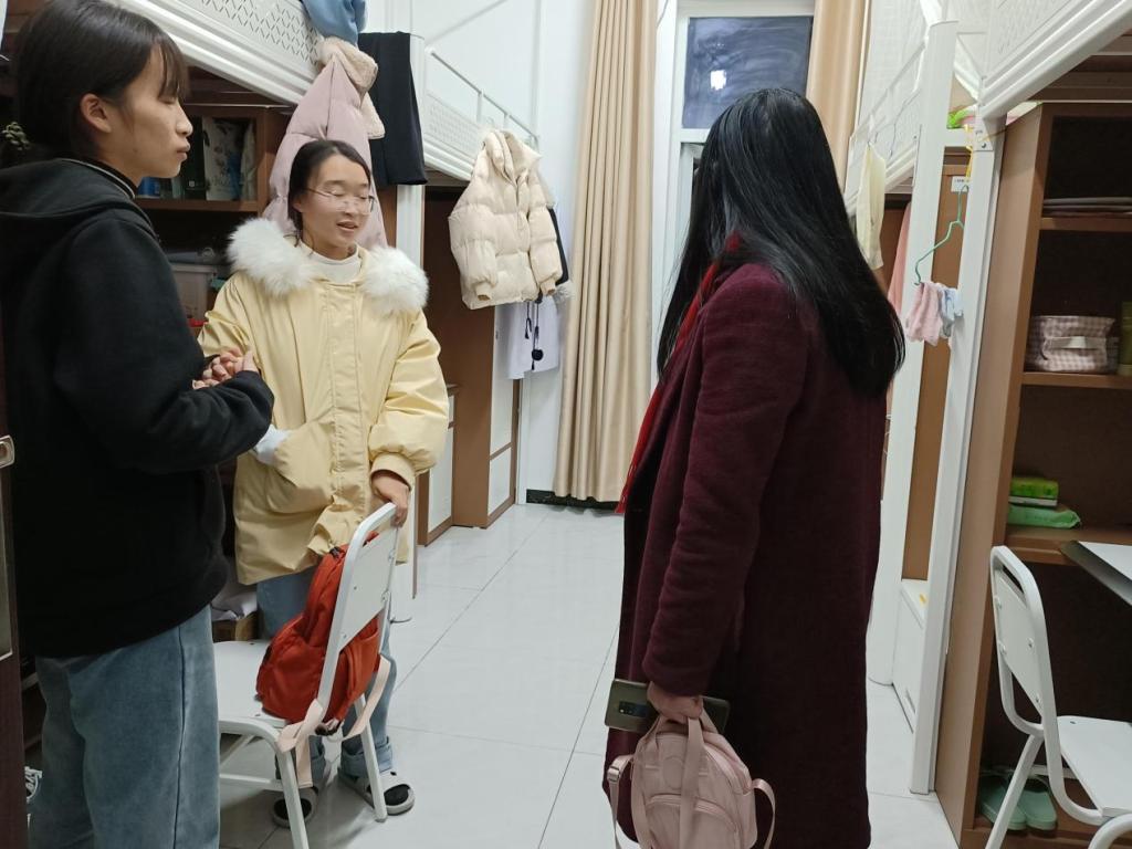 侯萍走访康复医学系学生寝室,重点检查了火灾隐患问题,如人离开时是否关电,热源附近是否堆放衣物,是否存在易燃易爆物品等情况。以本次检查为契机,对全体寝室学生进行安全宣传教育,发放安全宣传单,提高防火意识,要求学生做到人离开时关电;取暖设备不能烘烤衣物;意外停电后必须关掉总电源;电瓶车充电和易燃、易爆物品严格管理。温课迎考时期,关心学生复习及考试情况,关注学生情绪变化,叮嘱学生合理安排学习与锻炼,做到劳逸结合。
