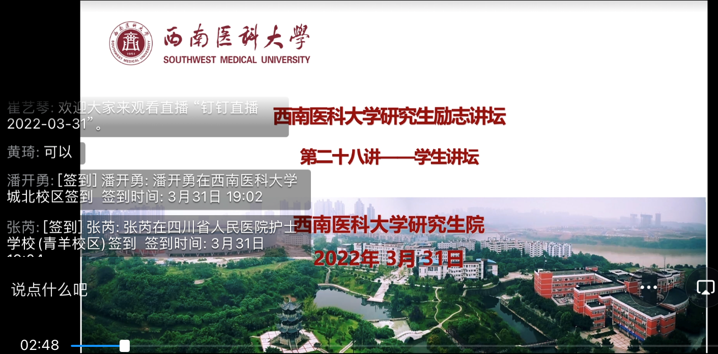3月31日晚,研究生院主办的研究生励志讲坛第二十八讲——学生讲坛在钉钉平台举行,我校两位2022届四川省优秀毕业生心血管医学研究所研究生崔艺琴和药学院硕士研究生邓琳琳,针对如何充实度过研究生三年生活等内容作了经验分享。
