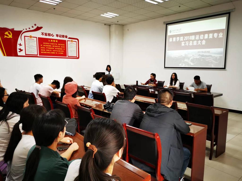 4月28日下午,体育学院在会议室召开2018级运动康复专业实习总结大会。学院副院长王晓芳、学生科科长李斌、运动康复系主任沙滟及2018级运动康复专业各基地实习生代表参加了总结大会。