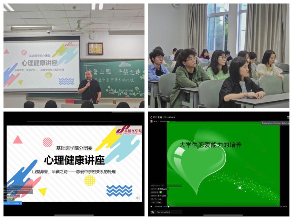 5月3日晚,基础医学院心理健康辅导站在海川楼204举办主题为“恋爱中亲密关系的处理”的心理健康专题讲座。人文与管理学院应用心理学教研室副教授游向宇担任此次讲座的主讲人,基础医学院各年级学生代表到场聆听,400余人线上观看。基础医学院学生叶林海担任主持人。