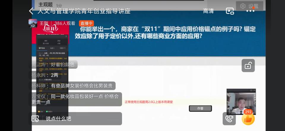 一切商业问题,都是从人开始;所有消费现象背后,都有其商业逻辑。5月5日晚,人文与管理学院市场营销教研室王刚通过线上方式开展了主题为“价格锚点”的创新创业讲座,人文与管理学院400余名学生参加了此次讲座。