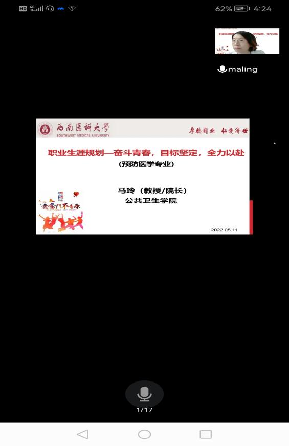 马玲以“奋斗青春,目标坚定,全力以赴”为题展开讲座,告诫同学们奋斗是青春最亮丽的底色。她从专业简介、就业以及社会需求等三个方面,详细的介绍了预防医学专业,树立了同学们的专业信心,激发了对专业的热爱。