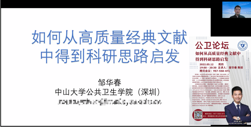 5月12日晚,中山大学公共卫生学院(深圳)邹华春教授应学院邀请,做客“公卫论坛”,开展“如何从高质量经典文献中得到科研思路启发”专题讲座。由于疫情的关系,本次公卫论坛通过线上直播方式进行,由学院学科办副主任范颂主持,公共卫生学院教职工及全体研究生参加了本次线上论坛。
