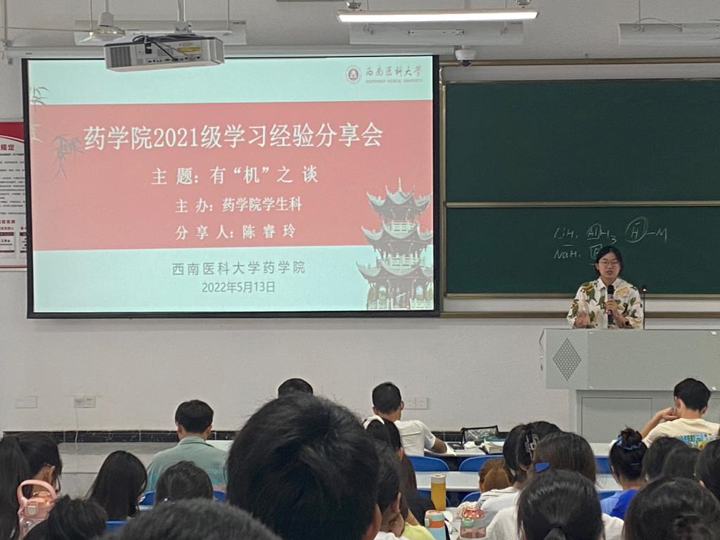 为进一步提升药学院2021级本科生专业知识学习能力,5月13日下午,针对如何科学高效地学习好《有机化学》,药学院在城北校区学海楼414教室,举办了“有‘机’之谈”学习经验分享会。基础医学院化学教研室张凯、药学院学生科辅导员熊玲玲,以及药学院2021级药学类学生参加了此次分享会。分享会由药学院2021级年级长陈智成主持。