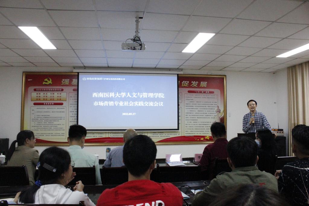 为提升市场营销专业学生的动手能力和创新精神,让同学们将理论知识应用于社会实践,5月17日,人文与管理学院市场营销教研室组织2020级市场营销专业全体学生到泸州宝光医药有限公司参加“研市场之理,践营销之道”社会实践交流。泸州宝光医药有限公司副总经理邱修春、办公室副主任邵玲、宝光药房连锁公司总经理助理李勇,人文与管理学院市场营销教研室王启凤、刘显红、李响、王刚、李平瑞5位教师参加了此次活动。
