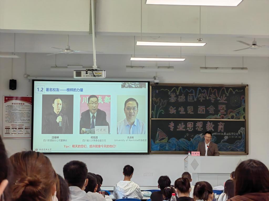 为加强同学们对基础医学专业的深入了解,培养专业意识,巩固专业思想,基础医学院于10月18日在学海楼205举办基础医学专业2022级新生见面会暨专业思想教育专题讲座。基础医学院党委书记阳静,院长吴建明,党委副书记、纪委书记黄钰,副院长涂江义,副院长谭晓秋,党政办公室副主任陈蓉,学科建设办公室副主任王译伟,教务科副科长许希燕,教师代表、兼职班主任、基础医学办辅导员和基础医学专业2022级新生参加了此次活动,活动由黄钰主持。