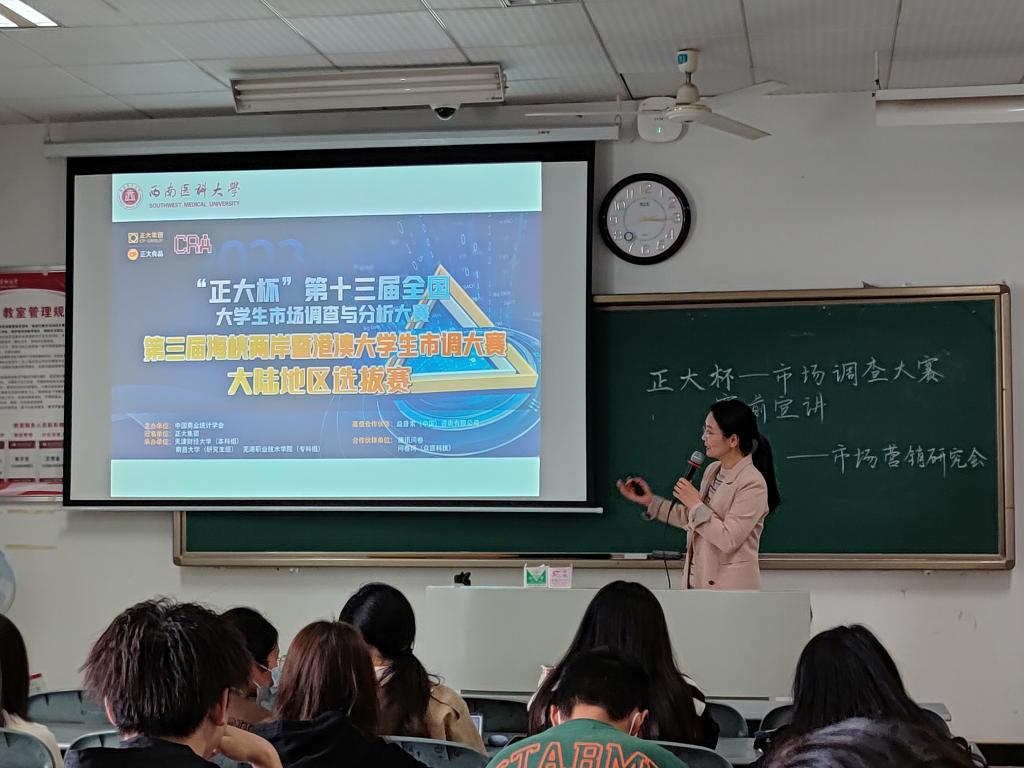 为增进学生了解第十三届全国大学生市场调查与分析大赛的赛程、规则和内容,11月5日,由西南医科大学人文与管理学院、西南医科大学市场营销研究会主办的市场调查与分析大赛宣讲会在海川楼605举行。市场营销教研室副主任王启凤,2022年获奖代表周冰倩、王天梅、罗琴,以及2020级、2021级市场营销专业参赛同学参加了此次宣讲会,宣讲会由市场营销研究会会长高垒主持。