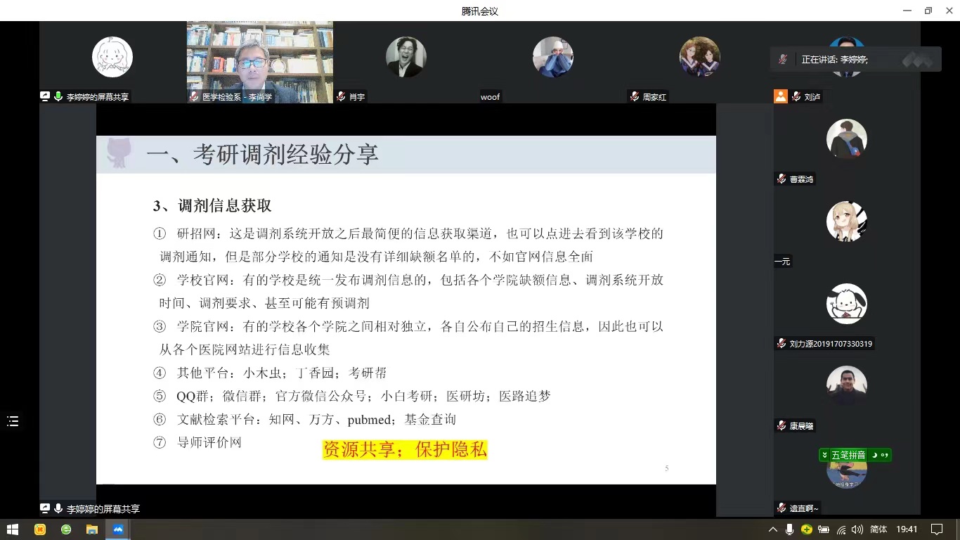 2月24日晚,医学检验系通过“腾讯会议”线上为2023届毕业生举办考研复试和调剂专题指导讲座,医学检验系党政办副主任朱喜丹,辅导员李尚学、刘泸以及医学检验技术专业2023届全体毕业生参加,此次讲座邀请医学检验系教师周家红、李婷婷及2022级硕士研究生曹霖鸿主讲。讲座由学生科科长李尚学主持。