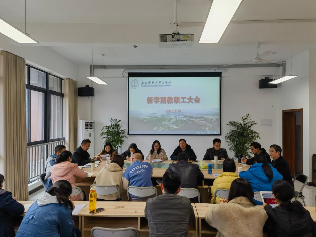 2月24日上午,法学院召开2023年新学期教职工大会,全体教职工参会,院长罗刚主持会议。