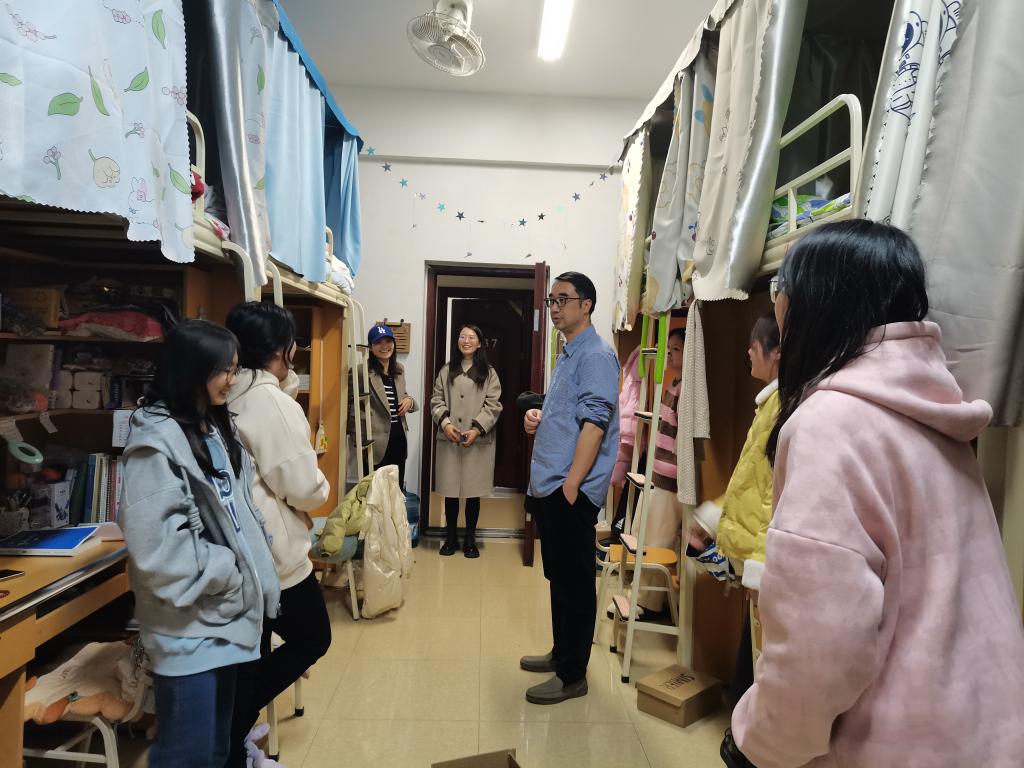 走访过程中,大家和学生们亲切交流,详细询问了同学们在假期期间的学习生活状况,并嘱咐同学们及时调整心态,以良好的状态迎接返校后的集中考试。同时还查看了各寝室的用电安全和卫生状况,提醒同学们保持个人寝室卫生,养成健康的作息规律,遇到困难可及时向辅导员老师反馈。