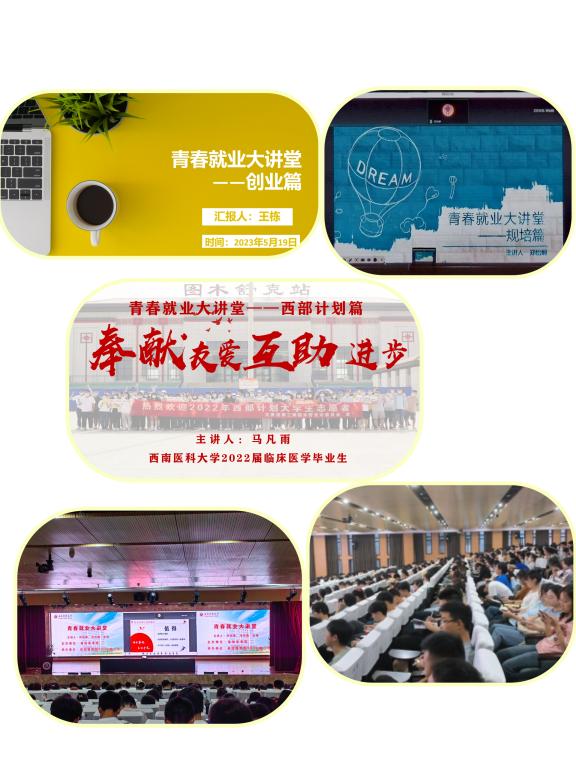 讲座共分为三规培篇、西部计划篇、创业篇三个篇章,分别邀请郑怡娴、马凡雨、王栋三位优秀毕业生分享经验。他们以自己的亲身经历与工作经验,就当前的就业形势与就业环境作出分析,讲述了以上三个方向的发展前景,以及可能遇到的困难、薪资待遇等方面的问题。同时,鼓励大家要拥有良好的心态,根据自己实际情况,在从多方渠道了解相关信息后,做好自己的职业规划,选择适合自己的就业方向。
