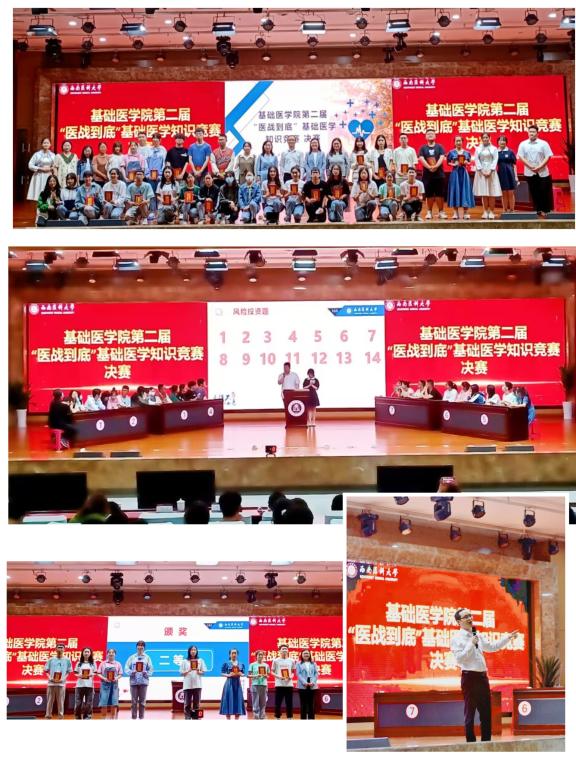 为检验同学们日常学习成效,在同学之间营造起“比”“学”“赶”“超”、积极进取的良好学习氛围, 6月4日晚,基础医学院在城北校区德城楼第一学术报告厅举行了第二届“医站到底”基础医学知识竞赛决赛。本次活动由基础医学院、睿思优学工作室主办,基础医学院2021级综合办公室承办。学生工作部(处)、招生就业处、学生资助中心副部长崔继东,教务处·高教研究所副处长汤军,基础医学院党委副书记、纪委书记黄钰,基础医学院教务科张春燕以及基础医学院各年级办公室的辅导员出席活动。基础医学院各学工办近400名学生参加了活动。