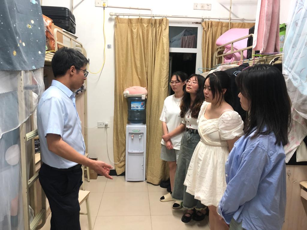 为深入了解期末考试季、毕业季和实习季学生思想动态,了解学生在学习和生活方面的情况,6月6日晚,医学检验系党总支书记吕春、学生科科长李尚学及辅导员刘泸、刘岩恕深入忠山校区2舍、4舍、7舍和城北校区3舍、30舍等寝室看望慰问实习返校学生、下基地学生和期末迎考学生。