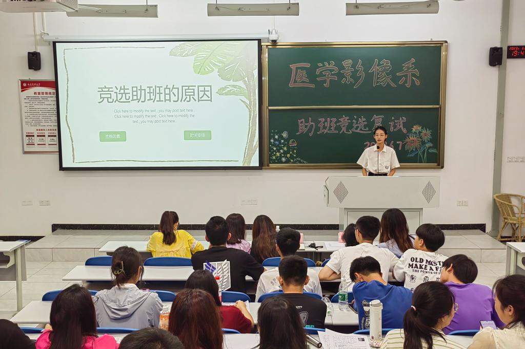 为2023级新生尽快适应在校学习与生活,6月7日晚,医学影像系于学海楼213教室开展了2023级新生助理班主任选拔工作。医学影像系辅导员郑琦、张文杰、梁姗及6位2022级优秀助理班主任担任评委。