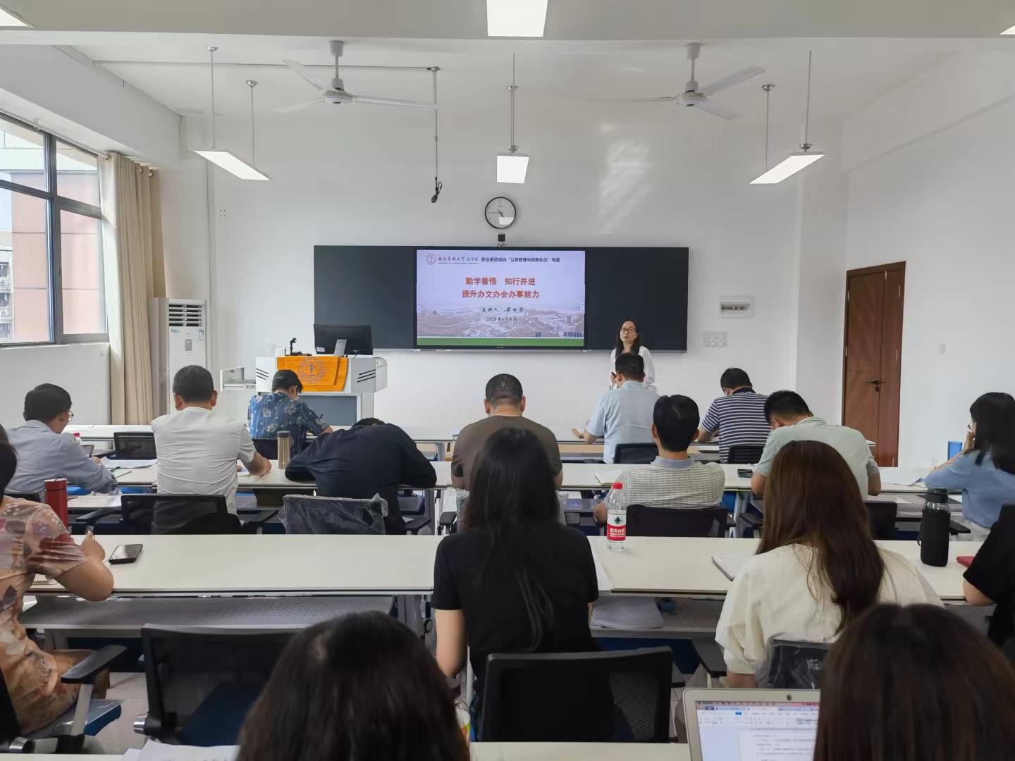 廖女男结合多年党政管理工作经历和公务活动的新趋势,以“勤学善悟、知行并进,提升办文办会办事能力”为题,对公文写作与处理规范、会议管理原则和程序、公务接待礼仪规范及保密要求等进行了详细讲解和经验分享,同时结合现代通信工具的发展趋势,对公务微信的使用规范及注意事项作了重点提示。