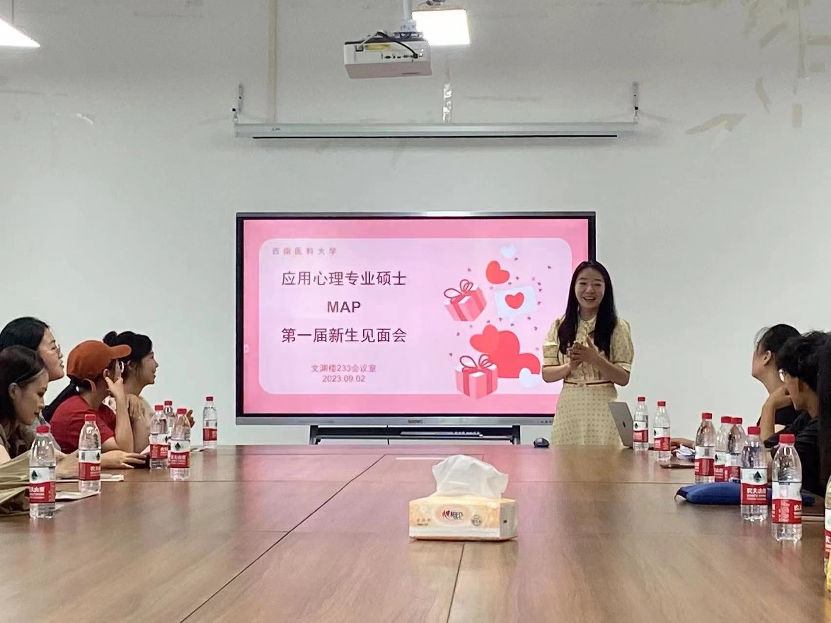 9月2日,人文与管理学院迎来应用心理专业第一届硕士研究生新生,为方便同学们交流,加深同学们对学校、学院和学科的认识,迎接即将到来的研究生生活,MAP教育中心在西南医科大学城北校区文渊楼233室举行了应用心理硕士首届研究生见面会。参加人员有MAP教育中心办公室主任宋杨,兼职辅导员韩玉果,2023级应用心理硕士研究生全体新生。