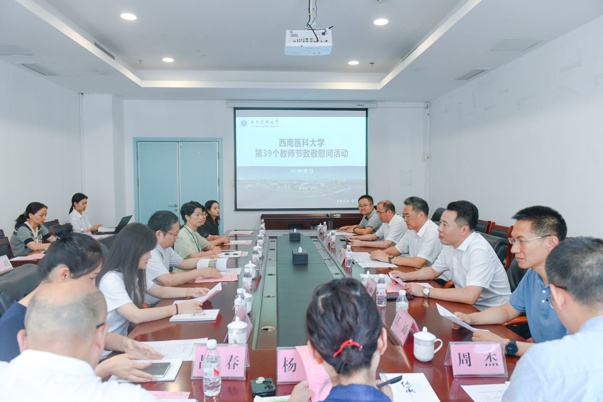 9月7日,西南医科大学附属医院党委书记廖斌、党政办主任唐柯、信访科副科长刘世雄一行,专程来到西南医科大学临床医学院•附属医院看望和慰问一线教师们,并为他们送上节日的礼物与祝福。