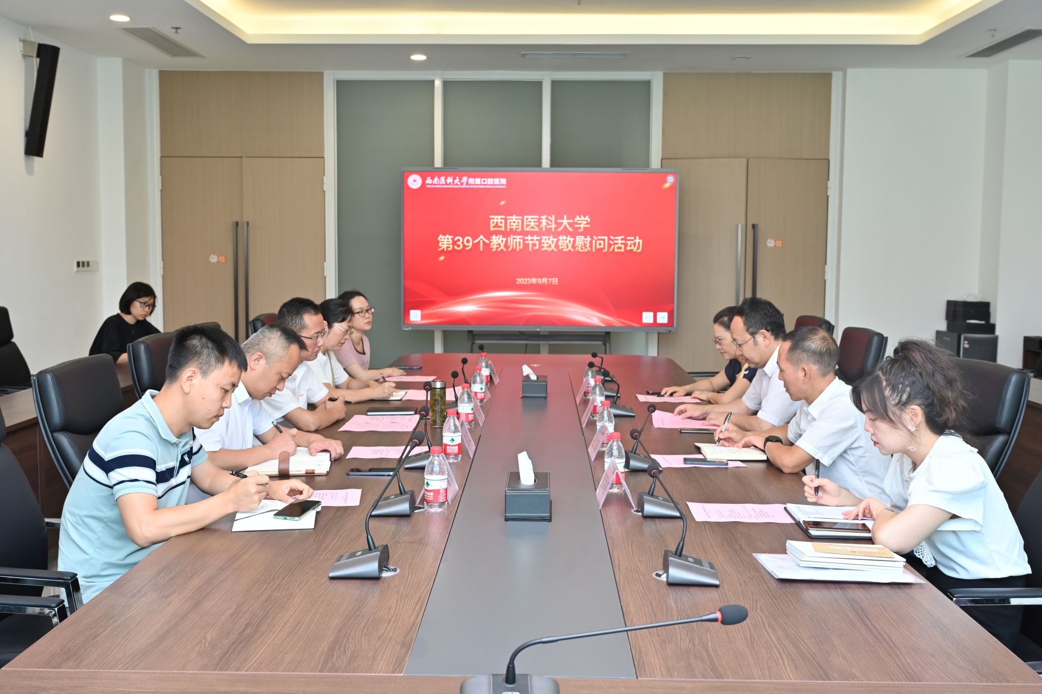 为在全校营造尊师重教的浓厚氛围,激励引导广大教师树立“躬耕教坛、强国有我”的志向和抱负,9月7日下午,在第39个教师节来临之际,学校党委常委、副校长聂敏海,学校武装部•保卫部部长张立新、基建后勤处处长龚虹在口腔医学院·附属口腔医院行政楼4楼一会议室亲切看望慰问了医院教师代表,医院党委书记代天祥、副院长郭玲、副院长屈进及教师代表参加了本次慰问。