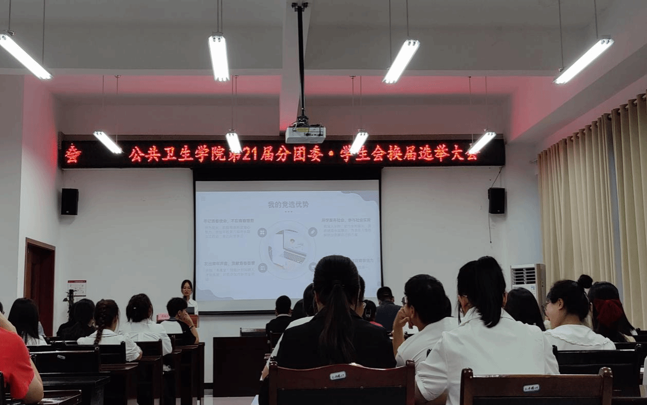 公共卫生学院分团委•学生会以培养和提高学生干部思想政治素养和社会工作能力,加强师生交流为基本目的的院级学生组织。日前,第20届分团委•学生会任期即将届满,为进行有序平稳交接,实现新老交替,分团委•学生会于9月8日晚7点在仁济楼319举行换届选举大会,公共卫生学院党委副书记金川、学生科科长彭丽冰、分团委书记孙夫钦、辅导员甘雪辉、徐正兴以及21名参选同学、部长团、主席团代表参加会议。会议由吴尚璘主持。