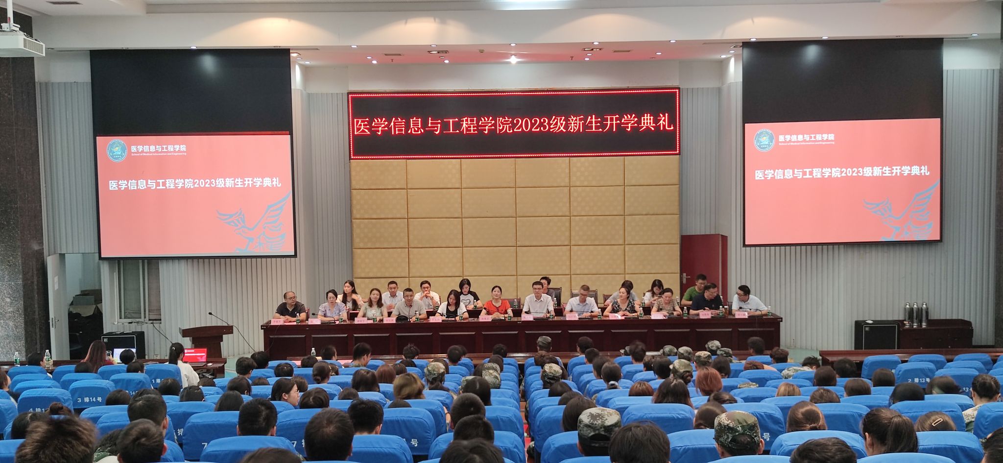 2023年9月17日,医学信息与工程学院在城北校区第二学术报告厅举行2023级新生开学典礼。医学信息与工程学院党委书记杨继宏、院长罗亚梅、副书记刘玉清、副院长黄志伟、各教研室主任、各行政科室工作人员以及2023级全体新生出席此次典礼。