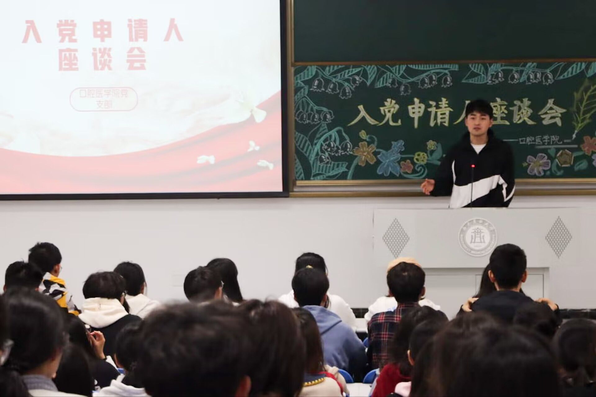10月19日下午,口腔医学院本科生党支部在西南医科大学城北校区学海楼502教室召开2023年入党申请人座谈会。团总支书记、本科生党支部支委雷杰担任本次座谈会主讲人,65名入党申请人参会。