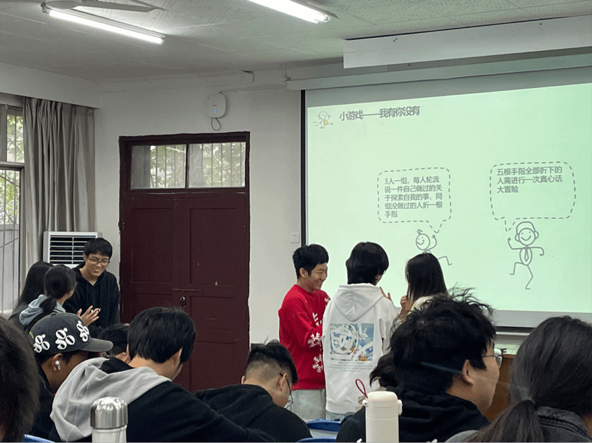各班以PPT讲解,以主题演讲、游戏辅导等多种形式开展了主题班会,深入浅出、生动有趣地向同学们科普了如何进一步提高自我与职业的适配度的相关内容,树立正确的自我价值观和职业观。23级2班心理委员就“认识自我”这一方面进行了演讲,带领同学们从自我意识、自我认知、自我评价、自我调控的四个维度,充分认识自己,了解自己的优势。整个演讲清晰流畅,同学们的接受度和认可度颇高。22级2班心理委员分享了一则《死亡诗舍》中的片段,让同学们尝试从“本我”“自我”和“超我”的角度辩证地看待影片中角色的命运,并回归现实问题仍平衡好其中的关系,适度地释放压力,保持相对平和的状态。