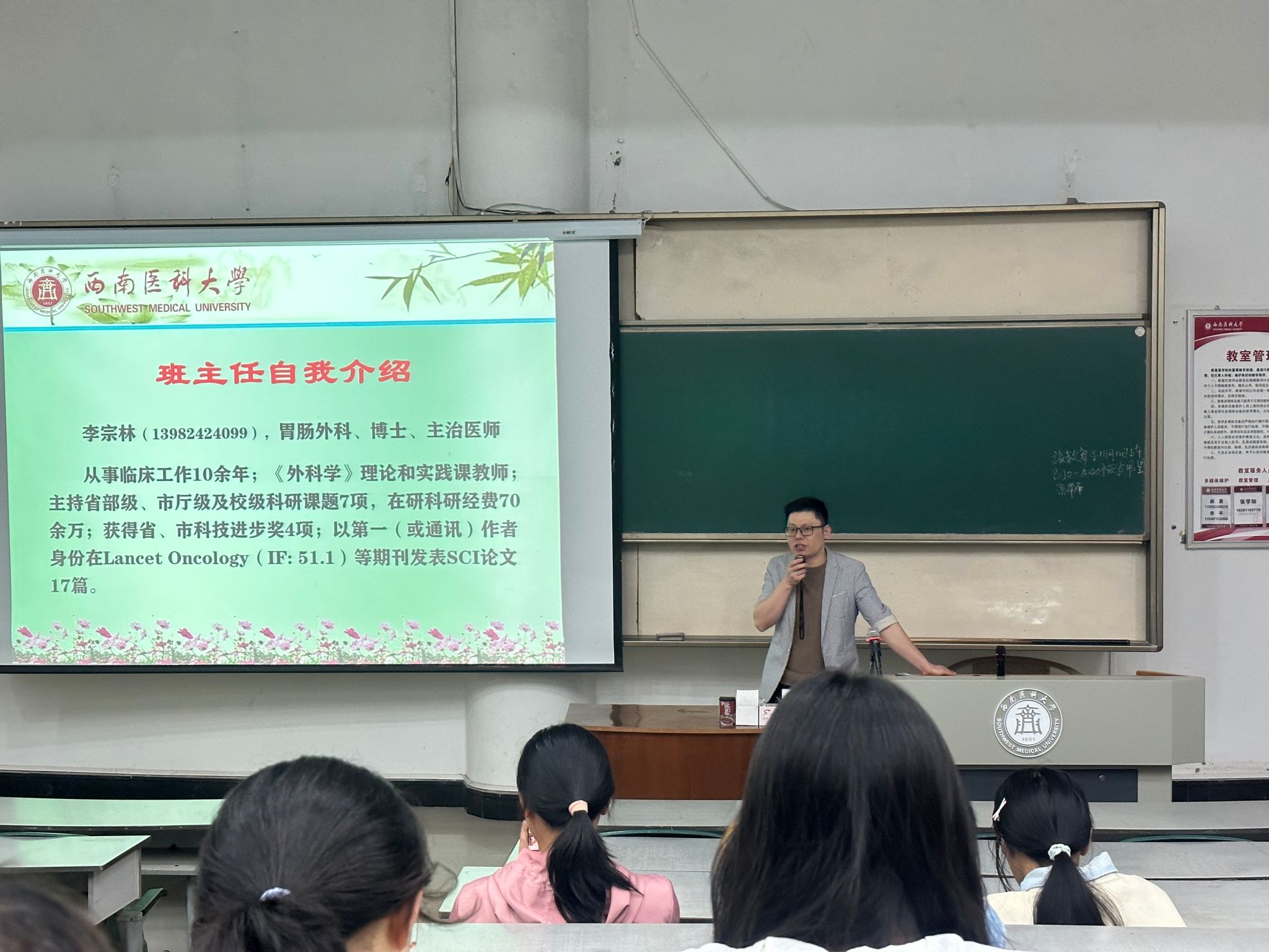 班主任李宗林老师介绍了自己的学习经历和专业特长,并以老师、学长和校友的身份表达了对同学们的热烈欢迎和深切关爱。李宗林老师从三方面做了重要讲话,他强调大学生要自始至终要树立爱党爱国的情怀,和为人民服务的人生价值观,同时强调医学生必须具备“医者仁心、救死扶伤”的职业信仰。他告诫同学们要遵纪守法,遵守校规,增强安全意识;洁身自好,培养正确的爱情观;正确处理学习和生活中的压力,保证身心健康。最后,李宗林就同学们的大学生涯规划做了指导,他鼓励同学们在学好医学专业知识的同时,一定要多参加科研、社团和社会实践活动,全面发展,踏踏实实做好每一阶段工作,规避一蹴而就的错误心理,提前为保研考研、毕业就业做好规划和准备。同时,他表达了对临床23班的殷切期望和坚定信心。