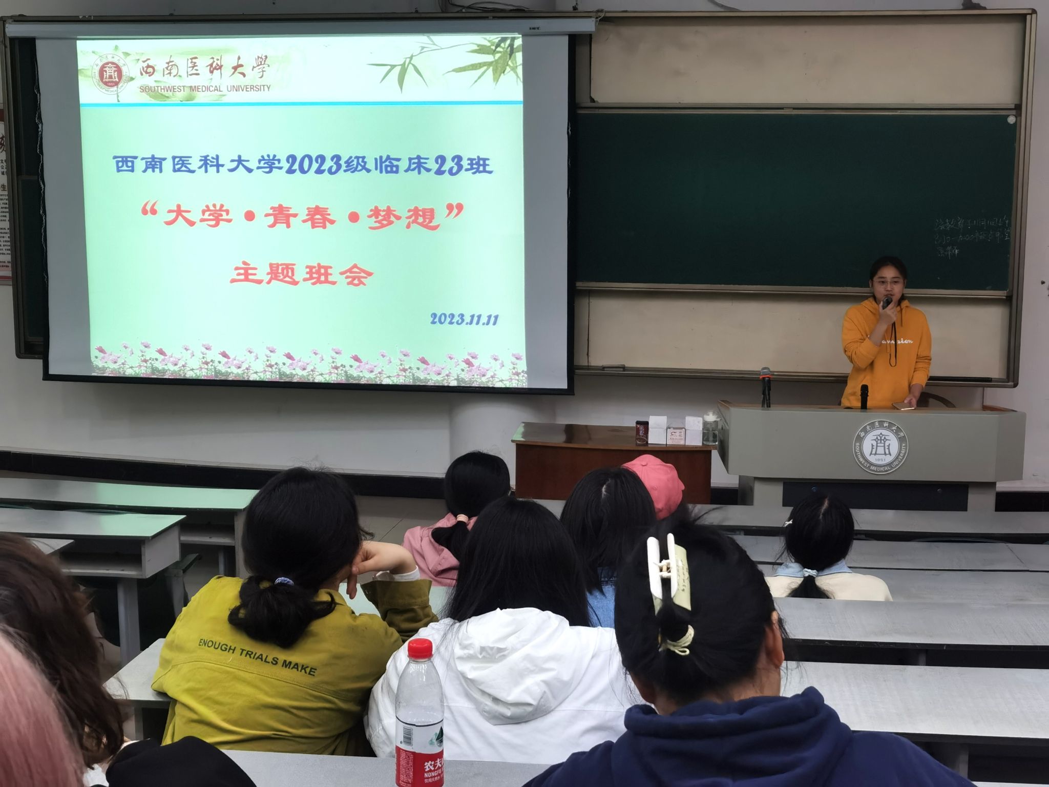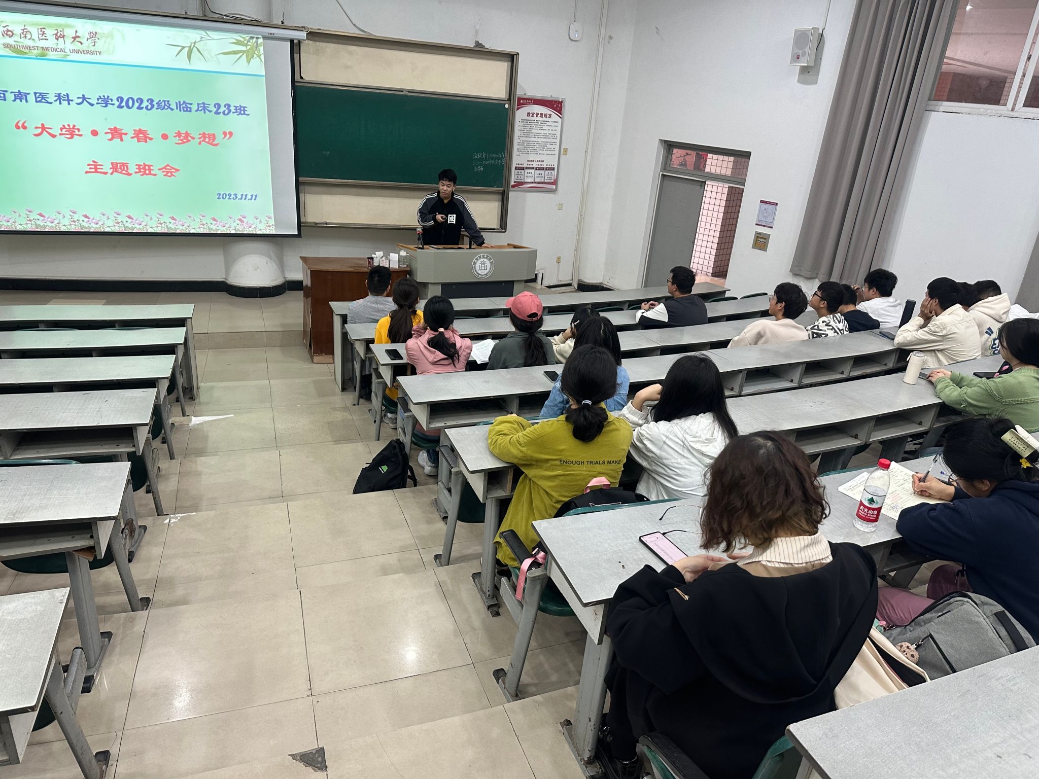 11月11日上午,2023级临床23班在城北校区荟文楼102教室召开了“大学·青春·梦想”主题班会。兼职班主任李宗林老师和全班同学在班会上就同学们的人生价值观、安全教育和学业规划等做了深入讨论和交流。班会在班长贾冰冰同学的主持下拉开帷幕。