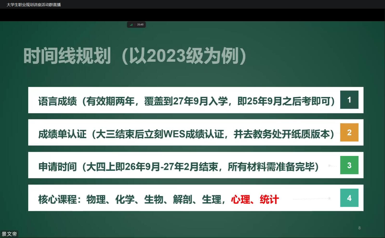 为加强学生职业生涯教育,帮助学生树立正确的就业观和择业观,指导学生合理规划自己职业生涯,康复医学系于11月20号通过钉钉平台举办第二十期明德大讲堂。本期主讲人为康复医学系2022届优秀校友、美国佛罗里达大学硕士研究生景文帝,共有130余名学生参加了本次讲座。