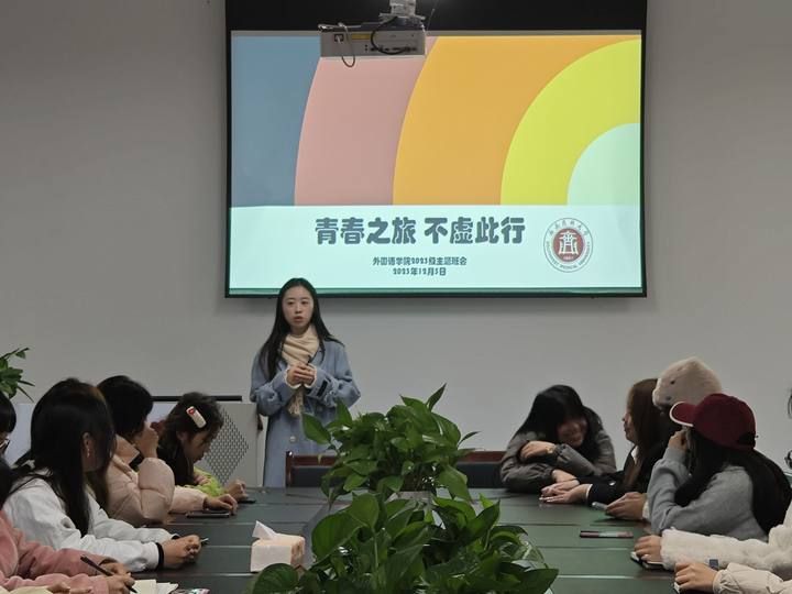12月5日下午,外国语学院于文渊楼134会议室举办以“青春之旅,不虚此行”为主题的2023级年级大会。本次班会由兼职班主任张瑞主持,外国语学院英语专业2023级全体同学参与。
