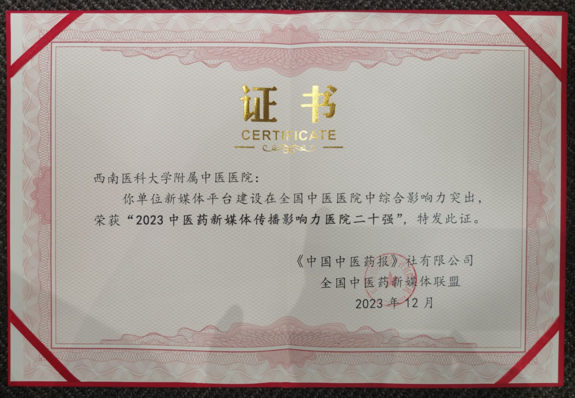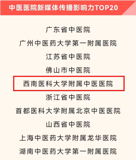 12月15-17日,由《中国中医药报》社、广东省中医药局主办的第三届中国中医药新媒体传播峰会暨人工智能与中医药研讨会在广东省珠海市举行。15日晚的颁奖仪式上,公布了2023中医药新媒体传播影响力榜单,西南医科大学附属中医医院微信订阅号荣获2023中医药新媒体传播影响力医院二十强,排名第5。