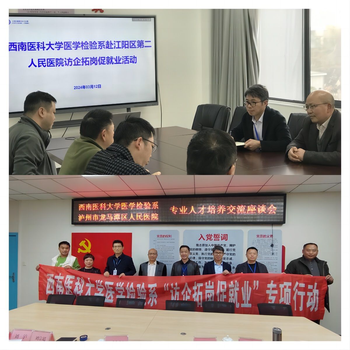 为加快推进2024届毕业生就业工作,全面落实学校“访企拓岗促就业”决策部署,充分了解用人单位需求,深入开展春季促就业攻坚行动,3月12-18日,医学检验系党总支书记吕春、党政办副主任朱喜丹、学生科科长李尚学、辅导员刘泸到泸州市多家医院开展“访企拓岗促就业”系列活动。