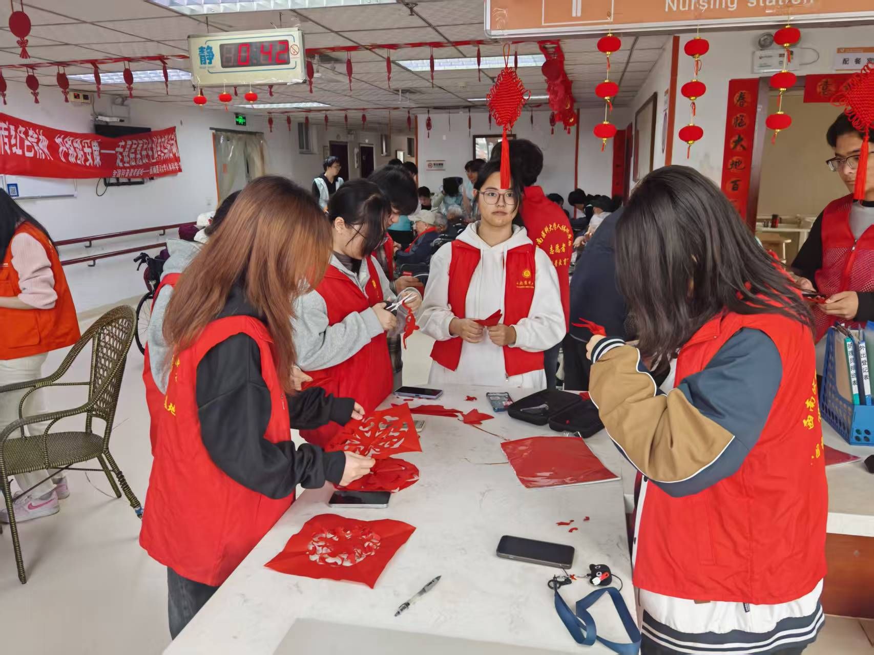 活动当日,志愿者们满怀服务热情,于周日上午准时抵达泸州市社会福利院。在完成场地准备工作后,学生代表登台致辞,向全院老人表达了诚挚的节日问候与美好祝福。随后的文艺表演环节气氛热烈、节目精彩。同学们先后献上了《我和我的祖国》集体合唱与《沁园春·雪》诗歌朗诵等节目,嘹亮的歌声与激昂的朗诵赢得了老人们的阵阵掌声。表演结束后,志愿者们陪同老人们进行了“击鼓传花”互动游戏,并为参与表演的老人送上了精心准备的围巾、艾草香包等小礼品,现场欢声笑语,其乐融融。为了更全面地传递关怀,活动进行了分组。由临床定向二班同学组成的第一志愿者小队,深入老人居室,亲切慰问了行动不便的长者,耐心聆听他们讲述往事,传递温暖陪伴。与此同时,临床21班同学组成的第二志愿者小队,则在一楼活动区组织开展手工活动,与老人们共同制作手串与剪纸。在细致的协作与交流中,深厚的情谊悄然建立。