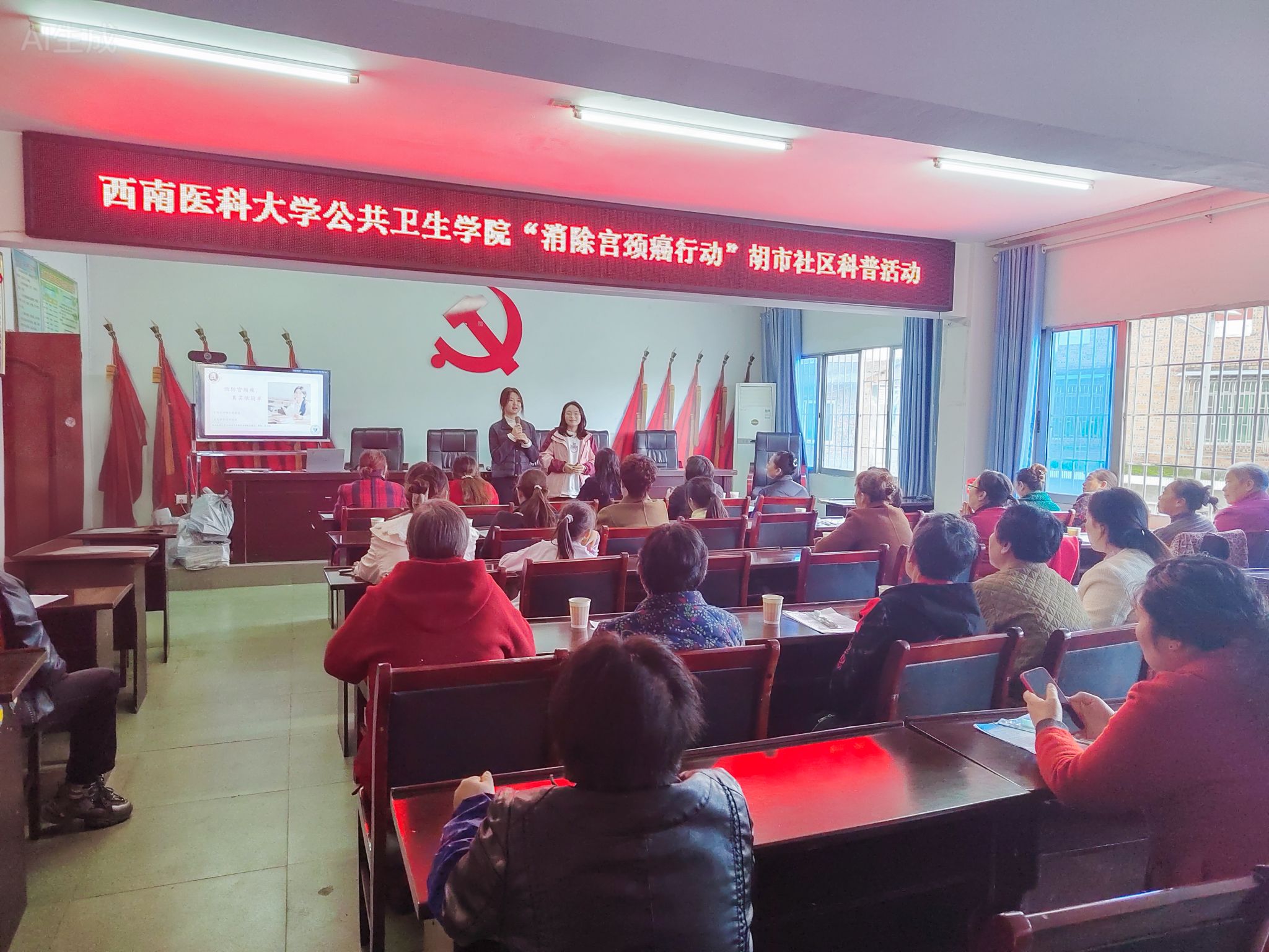 为积极响应世界卫生组织提出的“全球消除宫颈癌”的号召,提升社区女性健康意识,增强对癌症预防、筛查的关注,11月13日至14日,公共卫生学院本科学生党支部书记彭丽冰带队在泸州市胡市社区、黄荆山社区开展消除宫颈癌宣讲活动。入党积极分子缪蕊、张玉儒,严清娜、刘佳蕾担任宣讲员。