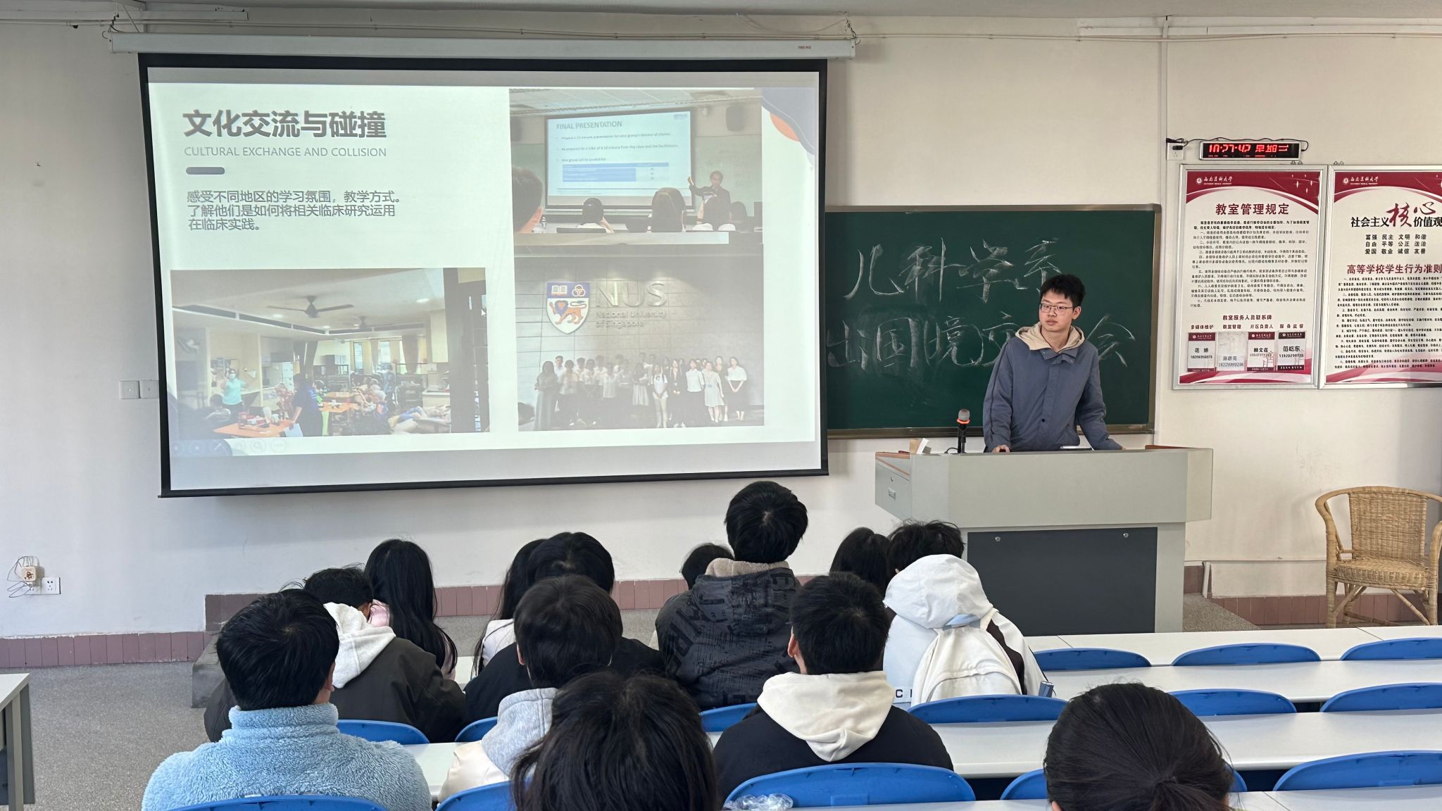 11月19日,儿科学系举办了出国访学经验分享会。会上,从新加坡国立大学(National University of Singapore, 以下简称NUS)访学归来的陈泉甫同学,以“狮城医镜:儿科医学的亚洲创新与实践”为主题,分享了他在世界顶尖学府的所见、所学、所感,为同学们带来了一场关于医学教育、临床前沿与跨文化思维的盛宴。