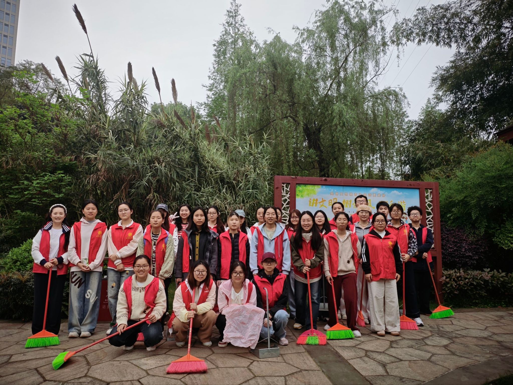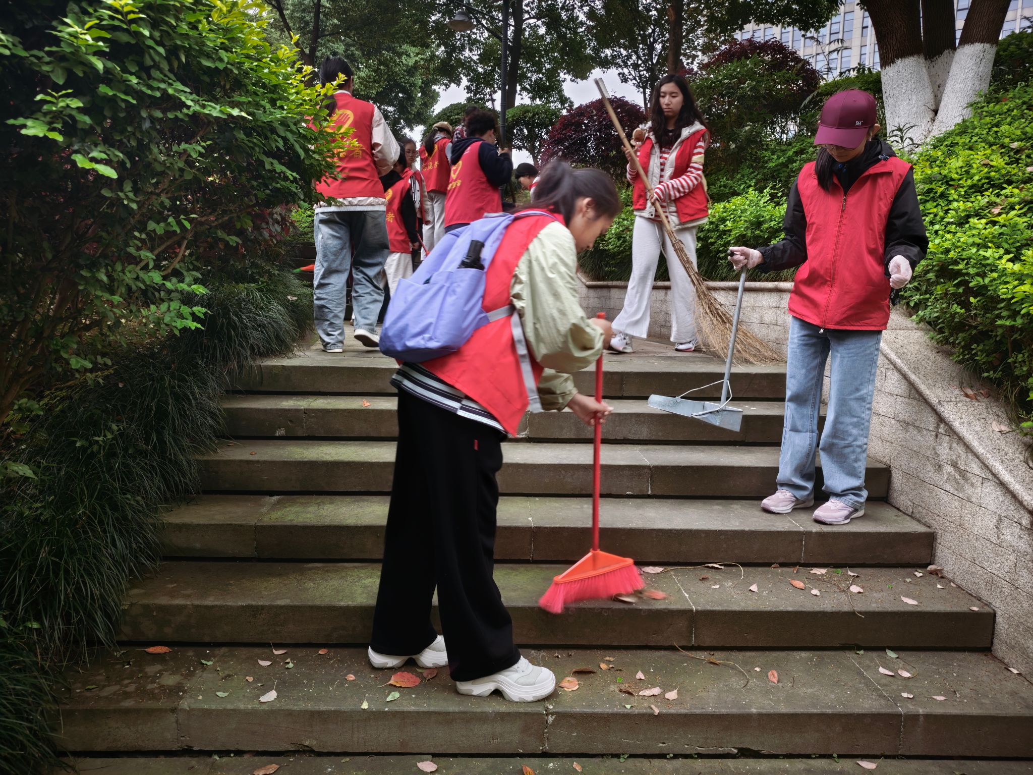 活动前期,志愿者与社区工作人员提前对接,明确清扫区域与分工,制定详细活动方案,确保志愿服务有序高效开展。活动现场,志愿者们身着统一红色志愿服,携带扫帚、垃圾袋、簸箕、夹子等工具,分成若干小组分头行动。大家不怕脏、不怕累,手持清扫工具专注清理社区公园的落叶、烟头、纸屑,仔细铲除绿化带内的杂草,逐一擦拭社区宣传栏、健身器材及公共座椅。清扫结束后,社区负责人对志愿者们的辛勤付出表示高度感谢,称赞志愿者们用实际行动传递了温暖,为社区营造了整洁、优美的居住环境,充分展现了我校青年学生的良好精神风貌。