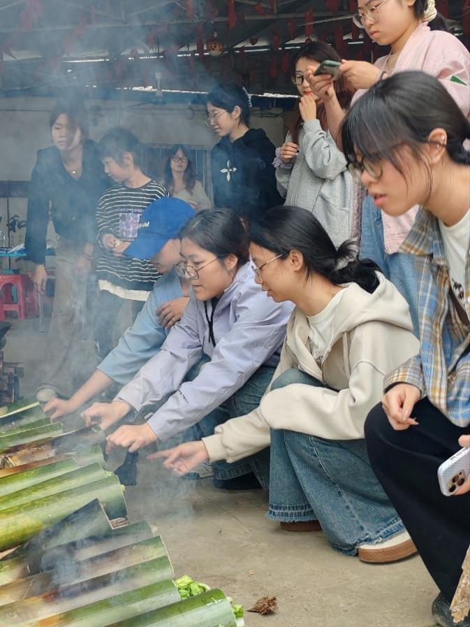 午饭过后,在农家驻地平地上响起了更加热闹的声响。扬子江班成员们分成三个小组,就地开启了别开生面的野趣厨艺赛——竹筒烧胡豆、柴火炒板栗。男生们利落地劈开青竹、架起石块垒成灶台,女生们则细心地将新鲜胡豆与调料塞进竹筒,再用土豆、青菜封口。另一旁,铁锅架在火苗上,板栗在铁沙中翻滚,噼啪作响,渐渐裂开金黄的果肉。大家分工协作,轮流扇风控火、翻搅试味,偶尔被烟熏得眯起眼睛,却笑得更加开怀。当竹筒劈开的瞬间,豆香混着竹韵扑面而来;板栗炒得绵软香甜,你一捧我一勺地相互分享,劳动的甘美在舌尖化开。活动后半程的烟火气,让徒步的疲惫化作了合作的暖意,也让春日的山野记忆,多了一份亲手创造的味道。