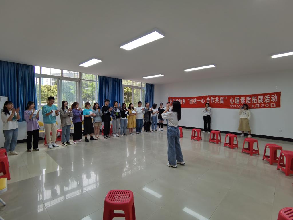 为进一步增强同学们团结友爱、互帮互助的意识,拉近同学之间的心理距离,营造积极向上、温馨和谐的氛围,3月20日下午,医学检验系联合学生工作部学生心理健康教育与咨询中心在荟文楼一楼心理健康服务中心1-6活动室开展主题为“团结一心,合作共赢”的心理素质拓展活动。本次活动特邀学生心理健康教育与咨询中心主任蒋玉梅莅临指导,医学检验系团总支学生会骨干成员、各班班长、团支书参加了此次心理素质拓展活动。