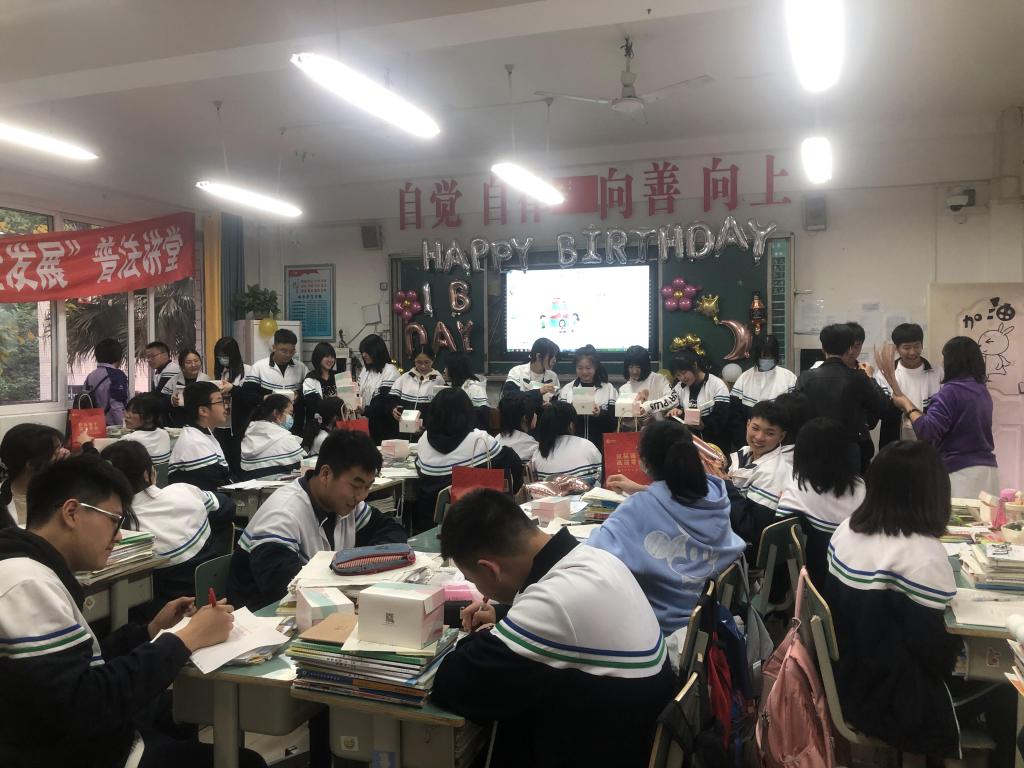 活动开始,班级开展了16周岁生日会,随后由学生讲师2019级法学侯鑫雨主讲,以《宪法》、《民法》、《刑法》、《未成年人保护法》知识为背景,结合16岁法定年龄所应承担的法律责任,结合案例以学法、守法、用法篇进行讲授。