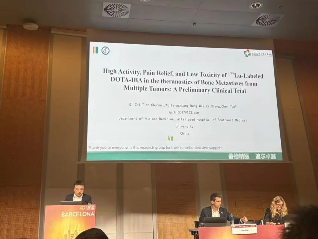 漆赤副教授以题为《High Activity, Pain Relief, and Low Toxicity of 177Lu-Labeled DOTA-IBA in the theranostics of Bone Metastases from Multiple Tumors: A Preliminary Clinical Trial》的研究作大会口头报告。研究结果显示镥177标记的DOTA-IBA(177Lu-TBM001)能够更高效的缓解和控制骨转移疼痛,缓解率超过80%,并可以缓解疾病进展。177Lu-TBM001治疗肿瘤骨转移具有治疗方法简便、靶向性强、骨髓抑制作用小、不良反应少等优点,是一种安全、有效的治疗方式。该药的成功研发和转化充分展示西南医科大附属医院在核医学诊疗一体化的创新成果与国际影响力。