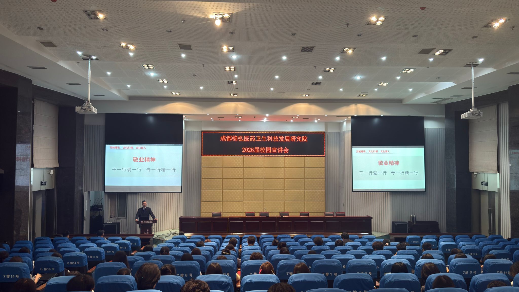 为拓展优质就业渠道,助力毕业生实现更充分、更高质量的就业目标,10月27日,人文与管理学院邀请成都锦弘医药卫生科技发展研究院于城北校区第二学术报告厅举办校园招聘宣讲会。本次宣讲会由成都锦弘医药卫生科技发展研究院理事长曾友元主讲,学院党委副书记马俊主持会议,学院2026届毕业生100余人积极参会。