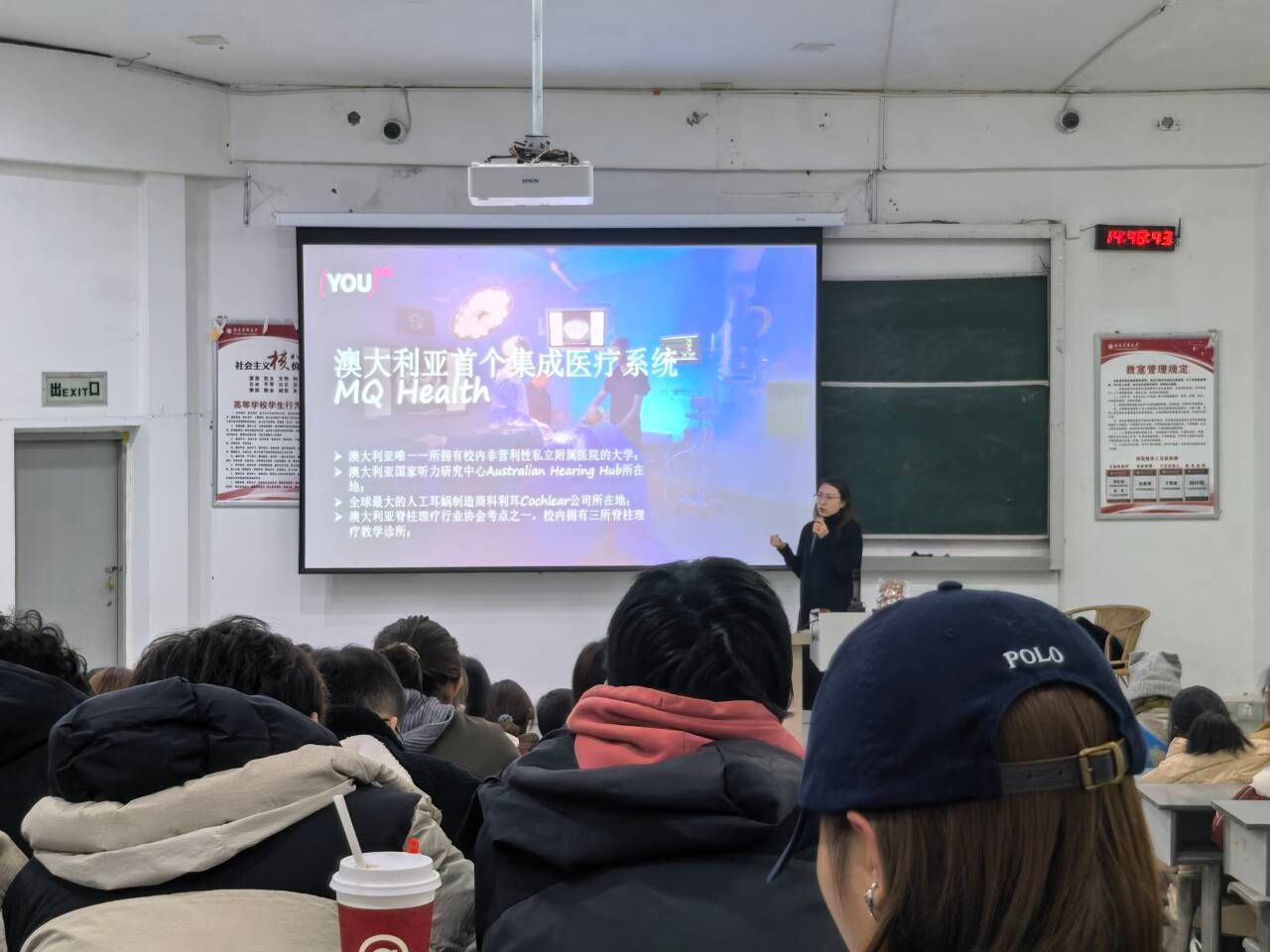 讲座聚焦于海外医学教育体系。蒋婷婷首先介绍了麦考瑞大学作为综合性大学的学科优势,重点阐释了其“医学健康学部”的教学特色及“MQ Health”临床医疗系统,展现了大学“医教研”深度融汇的培养模式。活动内容充实,逻辑清晰,首环节概述学校与临床体系,凸显其教学资源实力;随后蒋婷婷以“成为一名脊椎治疗师”为具体案例,系统剖析了该职业从诊断到治疗的能力图谱,生动呈现了海外康复人才的培养路径;最后的互动环节,学生们围绕课程设置、科研机会与申请条件积极提问,现场交流气氛热烈。