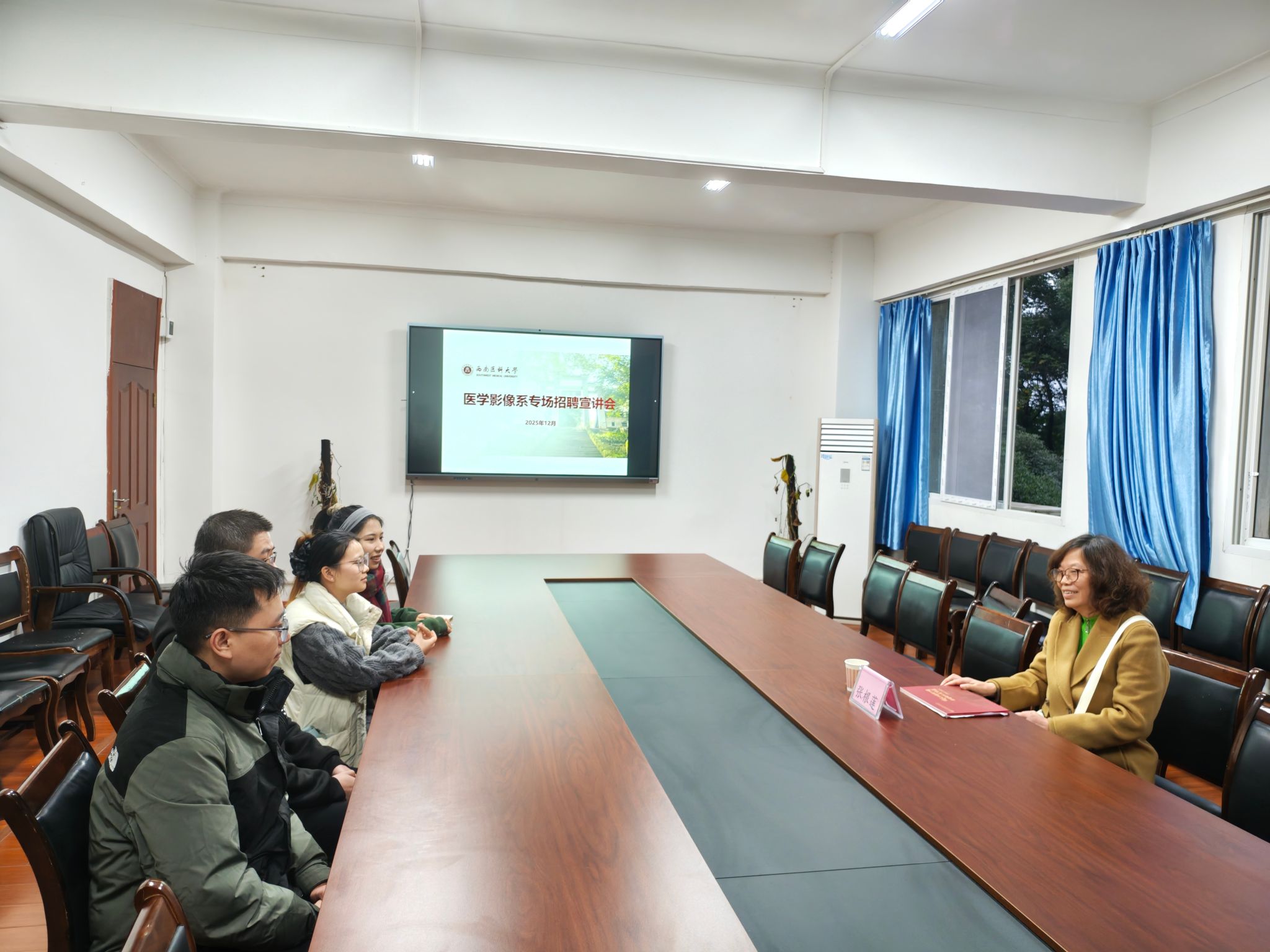 为精准对接用人需求,助力2026届毕业生充分就业,12月18日,医学影像系在含光楼临床医学院教务部会议室举办龙马潭区中医医院专场招聘会,龙马潭区中医医院放射科主任张根莲、医学影像系党总支书记刘秀、系主任舒健、学生科副科长黄敏及2026届毕业生代表共同参会。