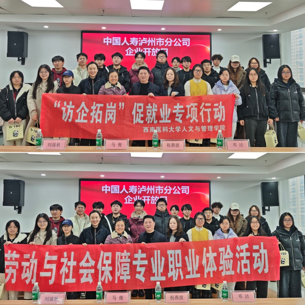 为深化产教融合、拓展学生就业路径,12月19日,人文与管理学院劳动与社会保障专业教研室组织师生赴中国人寿保险股份有限公司泸州市分公司,开展职业体验暨“访企拓岗”促就业专项行动。学院党委副书记马俊、专任教师刘琰秋及学生代表参加了本次活动。