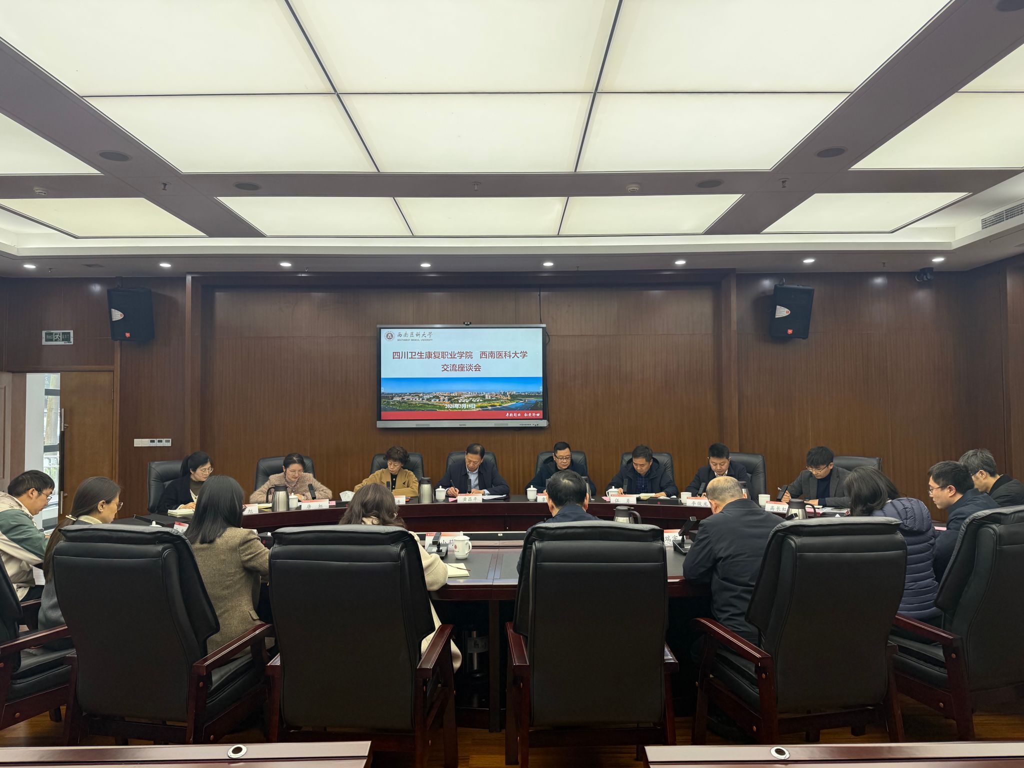 3月18日下午,四川卫生康复职业学院党委副书记、校长黄昌平、副校长章荣一行8人来我校交流座谈,会议在城北校区一会议室举行,学校党委常委、副校长聂敏海主持会议,两校相关部门负责人及互派干部参加会议。